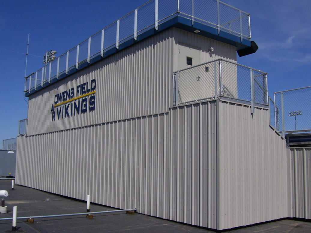 Interlocking Deck, Powder Coated Risers, 10' x 48' Press Box, Built over existing building, Closure Panels