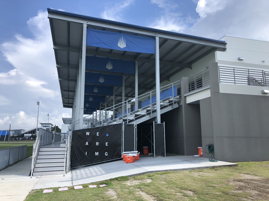 An ongoing partner with GT Grandstands, IMG Academy in Bradenton, FL ordered this new soccer stadium featuring galvanized steel I-beam construction and a full roof structure. The custom seating includes a 14” rise/33” tread for the ultimate comfort seats and best sight-lines for this site. The fully closed, interlocking deck and roof structure integrated with building behind the seating is also unique to this custom structure.